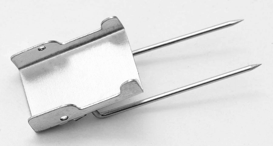 На лицевой стороне скобы закреплена игла или параллельные иглы со свободными концами, которые вкалываются в одежду простым движением сверху вниз.